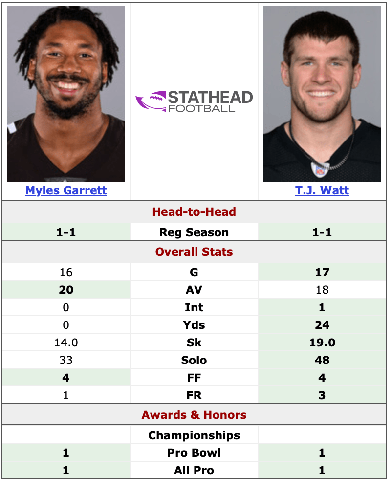 Maybe you’re a tackles for loss kinda person. Watt beats Garrett 19 to 17.