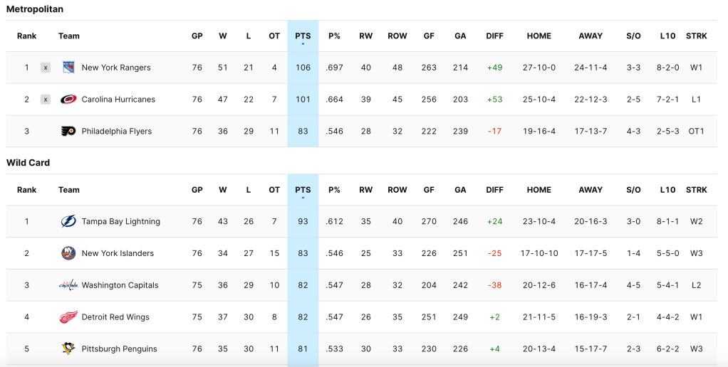 I left the Metropolitan Division standings in here as well, for an important reason. The Penguins currently sit two points back of the Islanders for the last wild card spot, but they also sit two points back from third place in the Metropolitan Division altogether.