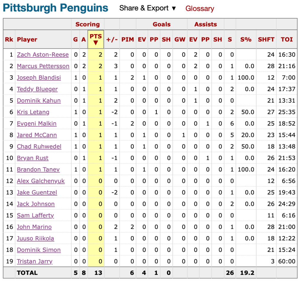 Tristan Jarry recorded 26 saves on 28 shots and got the win, and both Marcus Pettersson and Zach Aston-Reese put up multi-point games. Here’s a look at both teams from that night.